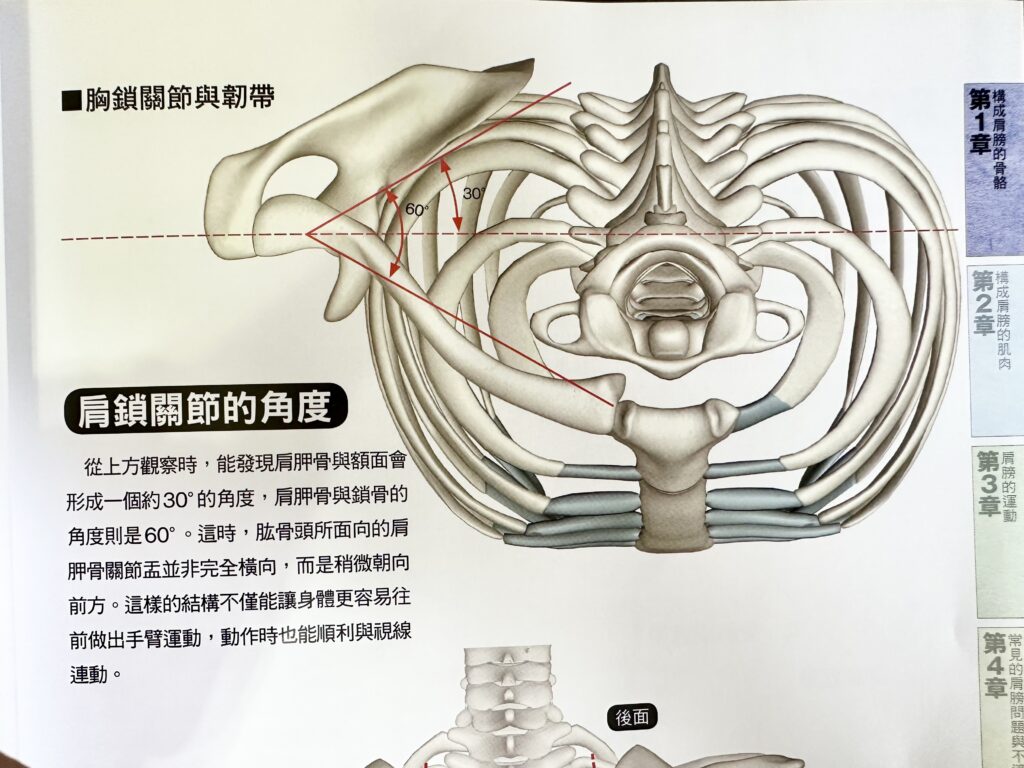 一般狀況下,鎖骨和額狀面有30度的夾角。肩胛骨和額狀面也有30度 的夾角。