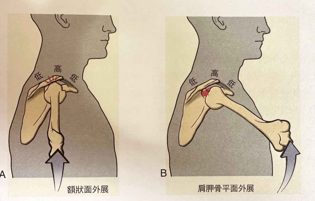 這個面我們稱為肩胛面,肱骨在肩胛面舉高會比較不容易夾擠到。
