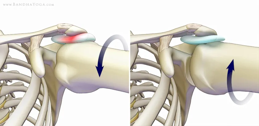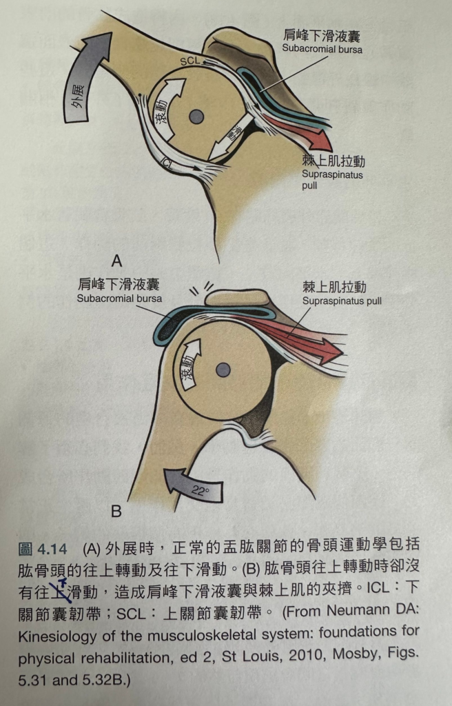 左圖:肱骨內旋的時候,大結節更容易夾到尖峰下滑囊。