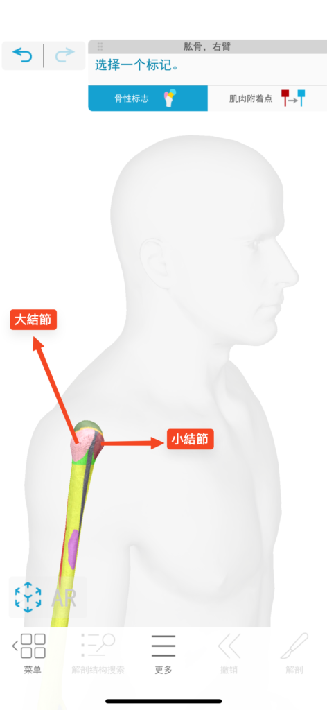 肱骨頭上面有兩個比較突起的地方,一個是大結節,另一個是小結節。