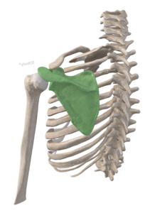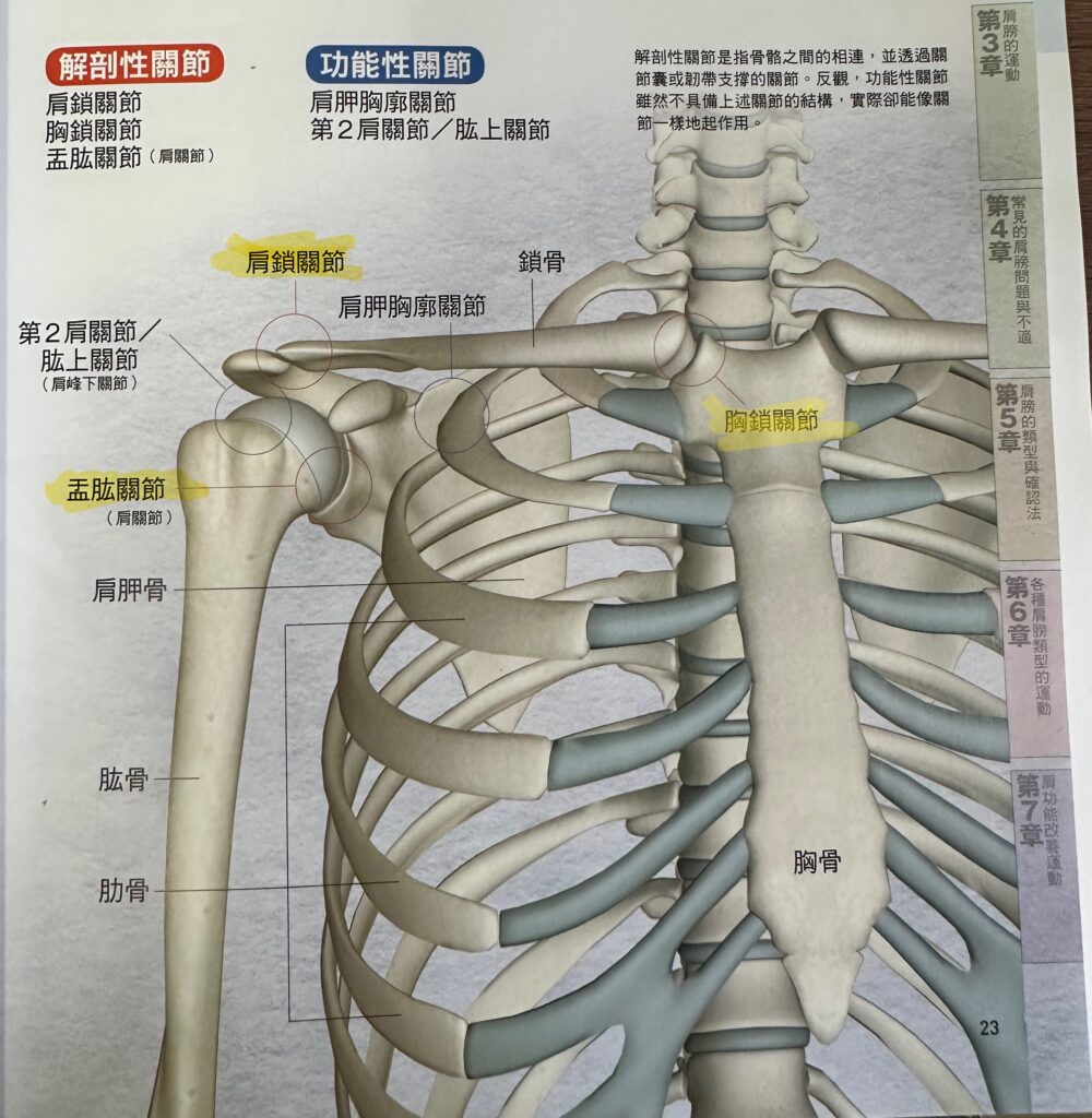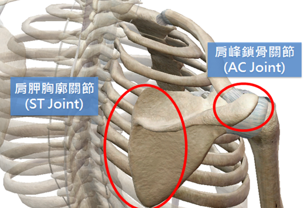 另外一個是肩胛胸廓關節,他是肩胛骨貼著肋骨的部分,但這個關節是沒有韌帶的,他是「看起來、動起來像關節」
