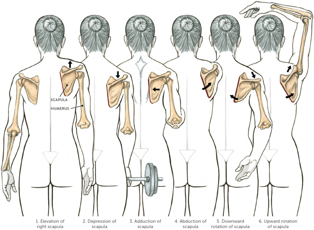 這裡指的是肩胛骨相對鎖骨的運動。其範圍其實不大,但很多方向都做得到。大概知道就可以了。