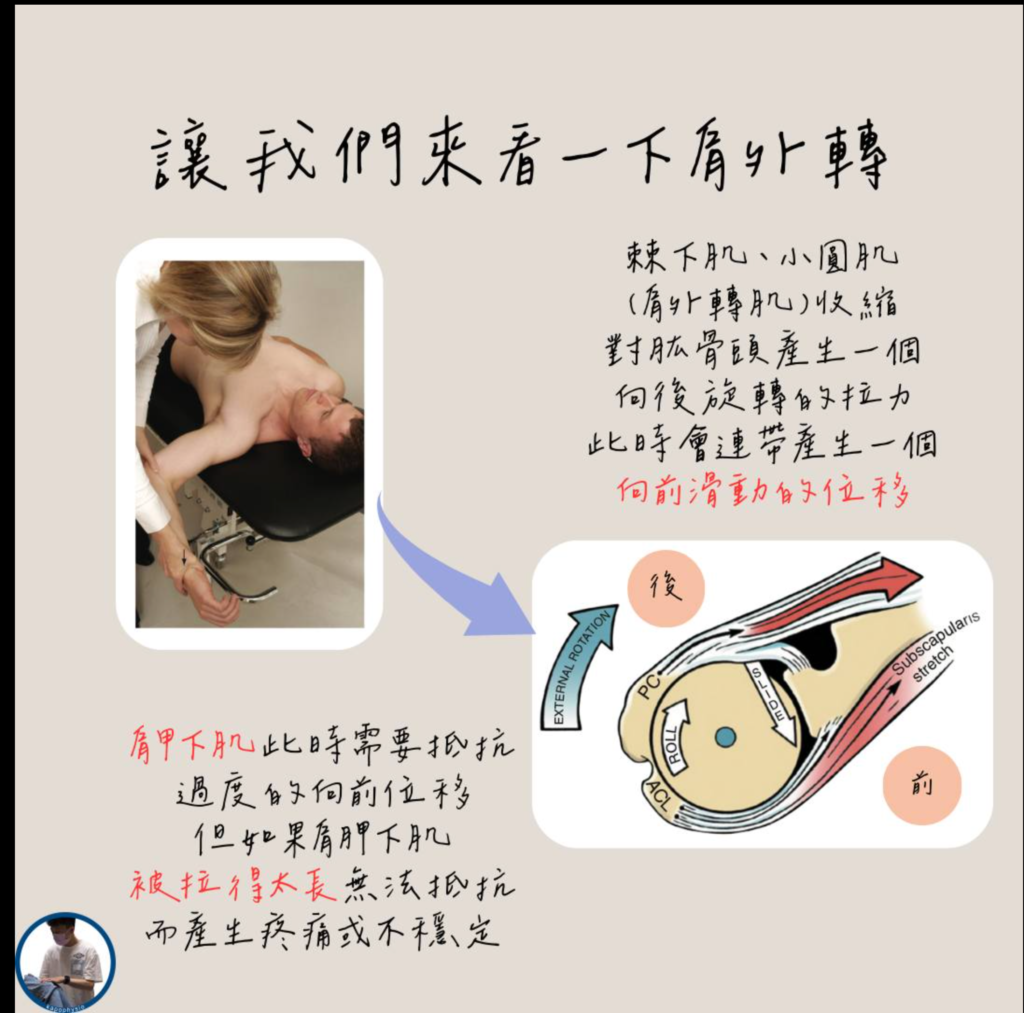 右圖:肱骨外旋的時候,大結節可以避開肩峰下方,會較不容易產生夾擠