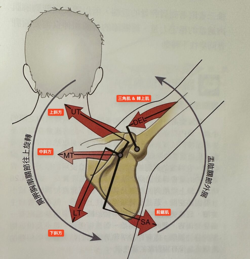 當肩胛關節正常外展時,盂肱關節和肩胛胸廓關節的活動角度會呈現約略2:1的比例。說人話就是,當你向 外舉起手臂180度,其中120度會來自你的盂肱關節,另外60度會來自肩胛胸廓關節。