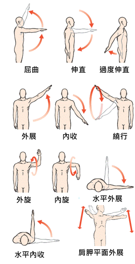 - 屈曲、伸直(也有人叫屈曲伸展,屈曲是往前抬手臂,伸展是下放或是向後延伸手臂)