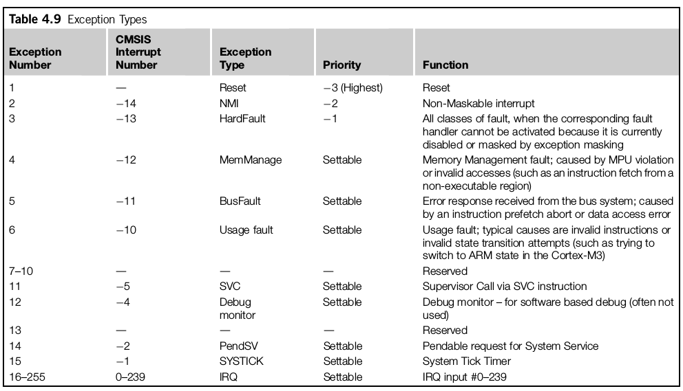 可以觀察到exception number越小,代表事情越大條。而編號16~255總共240個例外都交給Interrupt使用。