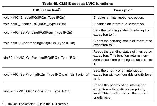 CMSIS 提供了控制NVIC register的function。你可以透過CMSIS來控制優先權。包括啟用、停用某個exception,設定某個Interrupt的優先權等。