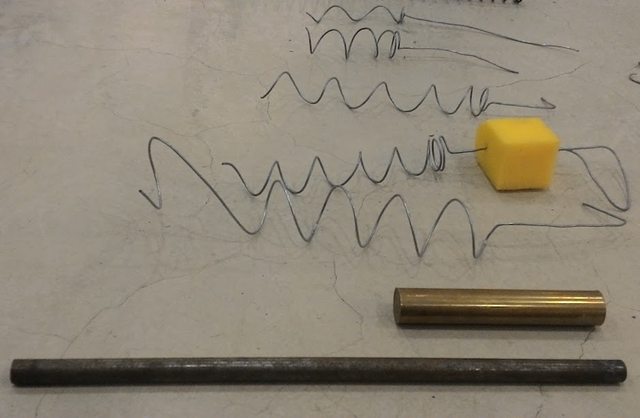 於是我去買了鐵絲,跟愷宏要了鐵棒,然後用老虎鉗把鐵絲繞在鐵棒上,做了個螺旋出來。我把螺旋用墊板包住,在上頭放了一些冰塊做測試,每轉一圈冰塊就掉一些出來,感覺相當令人愉悅。我做了幾種不同螺距的螺旋,想要找到一個最適合的形狀。