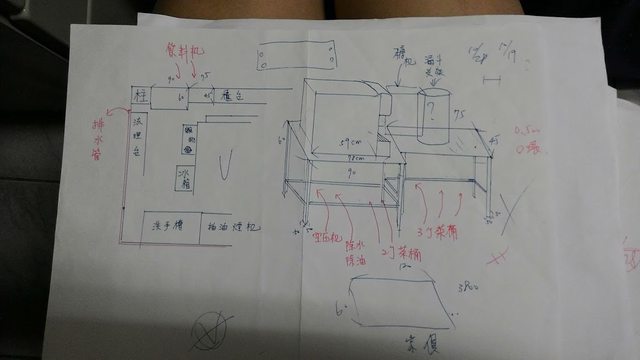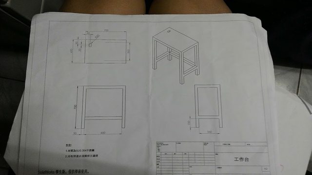 我拿起愷宏畫好的設計圖,跟他比劃:「我要兩張,一張大一張小的,長度寬度是這樣、然後希望能承重200kg,所以焊接要穩一點,材質的話要白鐵的。」