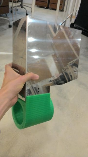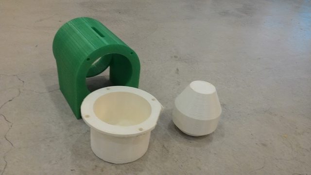 於是我們用3D印表機印了一些零件,裝在金屬冰盒的出口下方,我們希望透過錐狀物去衝擊出口冰塊,讓冰塊能夠散開,穩定的從洞口出來。