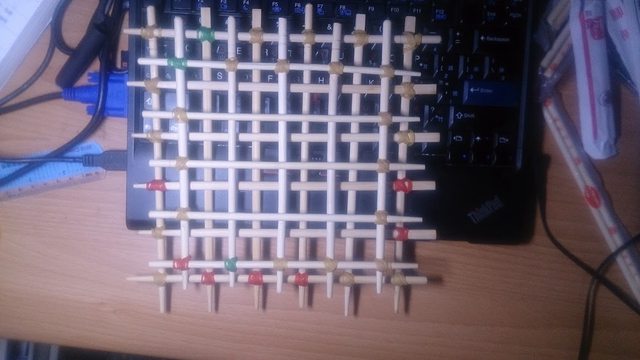 我想先從比較簡單、不使用複雜機構的方式著手,於是便設計了一個雙層篩網,希望能把那些相連的冰塊擋在篩網上,只讓單顆冰塊通過,減少因為冰塊過大卡在洞口的問題。我用竹筷和橡皮筋快速的做了一個模型,便跑去飲料店挖冰塊做實驗。